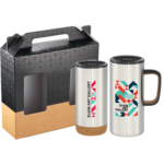 Do not miss out on one of the best gift sets of the year. Includes the tumbler with skid-proof cork bottom 1625-69 16oz and the mug with cork featured handle 1625-48 16oz. Durable, double-wall stainless steel vacuum construction with copper insulation, which allows your cold beverage to stay cold for 24 hours and at least 8 hours for hot beverages. The construction also prevents condensation on the outside of the piece. Leed's Exclusive 16oz. Gift Box is not decorated. Photographixx is not available for the set. There might be tiny color variance across the components in a set. “For additional protection, all Drinkware pieces will be individually polybagged and inserted in the gift box.”