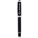 Cap off design with gloss black enamel upper barrel with carbon fiber detailing in lower barrel. Highlighted with chrome accents. Pen includes premium black roller ball ink cartridge.